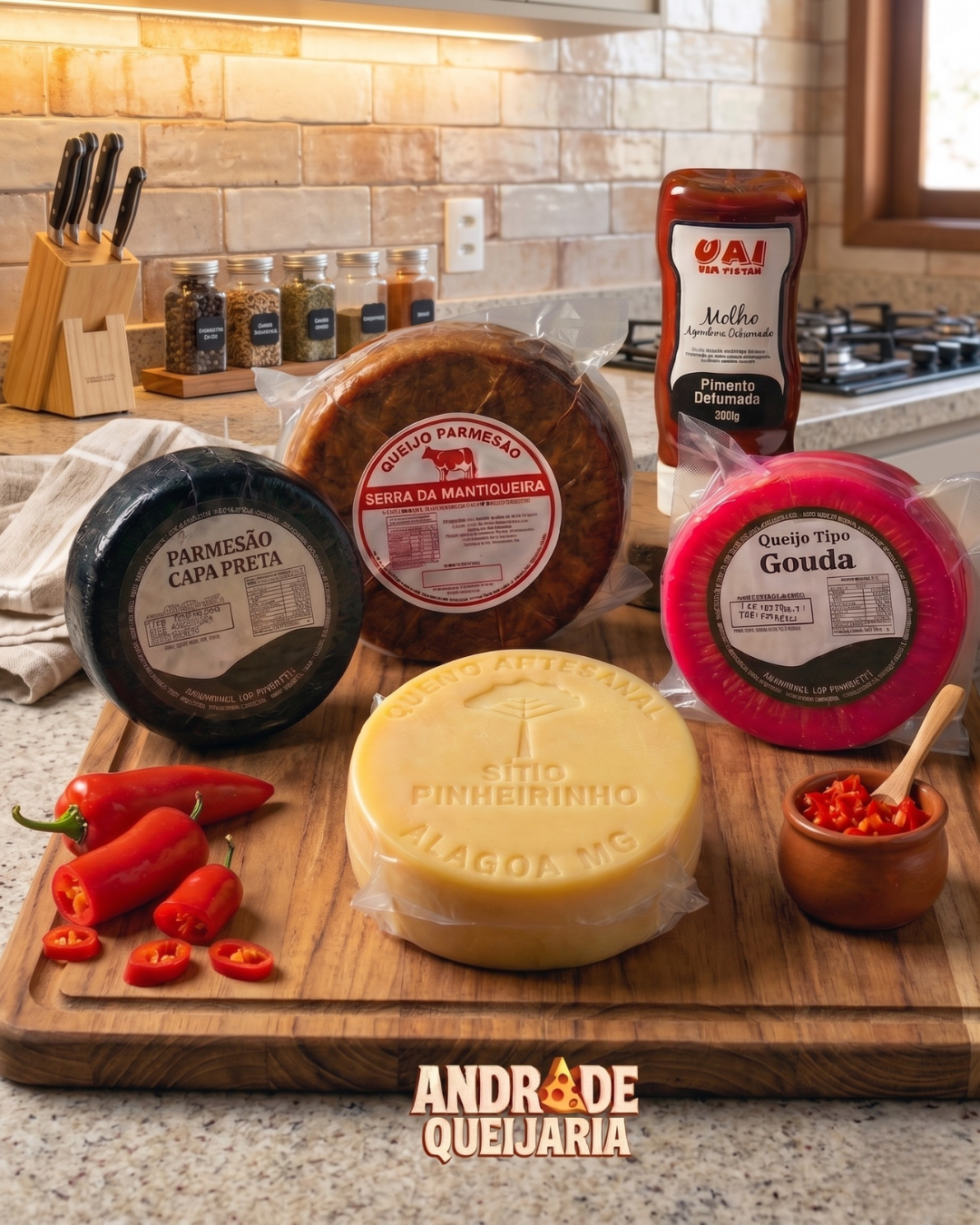 Dica: Coloque o Capa Preta no centro pela sua beleza visual. Sirva a geleia de pimenta sobre o Gouda ou o Defumado para um contraste incrível.